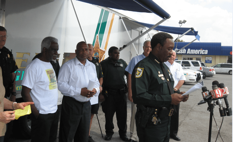 Demings, as he announced the drug and firearms bust, was flanked by several of his deputies, including Sergeant Jim DeLeu, who lead the operation on Thursday and Deputy Sheriff Quincy Alleyne of the POPS Unit. Also present were several community members, including Hardee’s restaurant owner, Tim Haberkamp, Pastor of the Divine Way Ministries, Rev. Mike Kimborough, and Mrs. Bertina Busch of the Pine Hills Community Council.