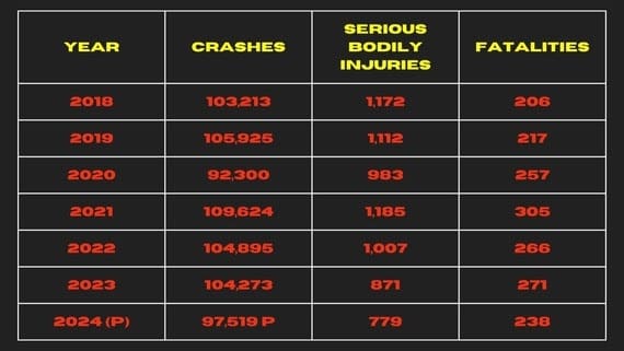 Despite ongoing efforts, many key statistics have remained constant over the years. Hit-and-run crashes often occur during dawn, dusk, low light, or inclement weather. Pedestrians and cyclists represent the highest number of fatalities.