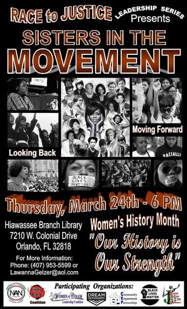 Sisters in the Movement will be held at the Hiawassee Branch Library (7210 W Colonial Drive) on March 24th at 6pm.
