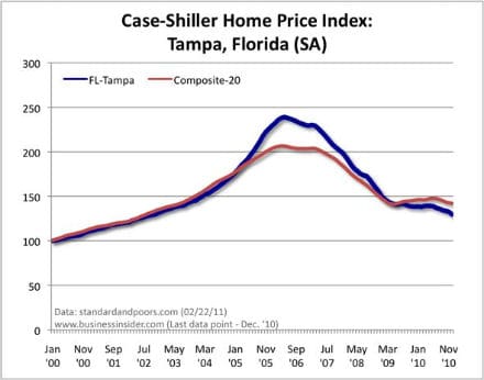 The S&P/Case-Shiller 20-city monthly Home Price Index released today, revealed 11 of the cities, including Tampa and Miami, at new lows in December 2010, since their 2006/2007 peaks.