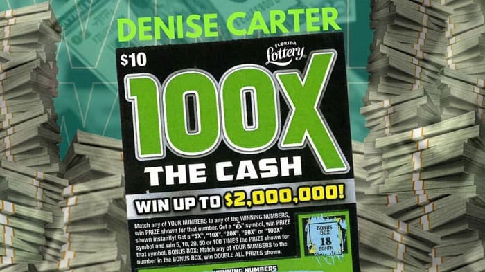 The Florida Lottery announced that Denise Carter, of Ft. Pierce, claimed a $2 million top prize from the 100X THE CASH scratch-off game at the Lottery’s West Palm Beach District Office.