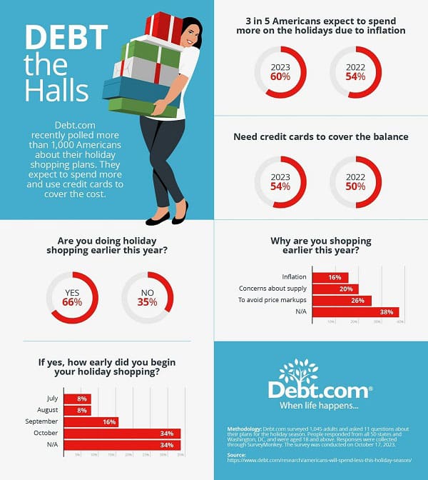 Debt.com polled 1,000 U.S. adults about their holiday shopping plans. More respondents (60%) than last year (54%) feel they will spend more on holiday shopping this year because of inflation. Among those respondents, 3 in 5 (54%) say they will use credit cards to cover the cost of holiday shopping.