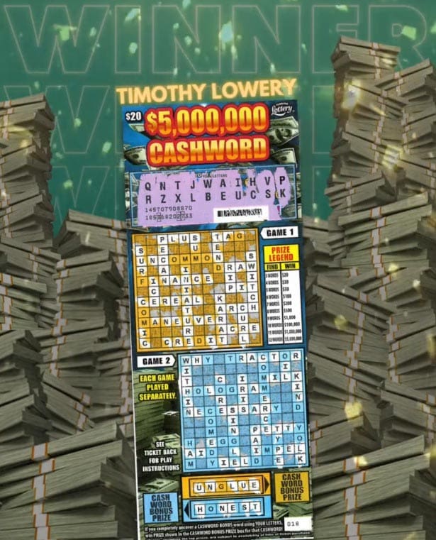 The Florida Lottery announced that Timothy Lowery, of Tampa, claimed a $1 million prize from the $5,000,000 CASHWORD scratch-off game at Lottery Headquarters in Tallahassee.