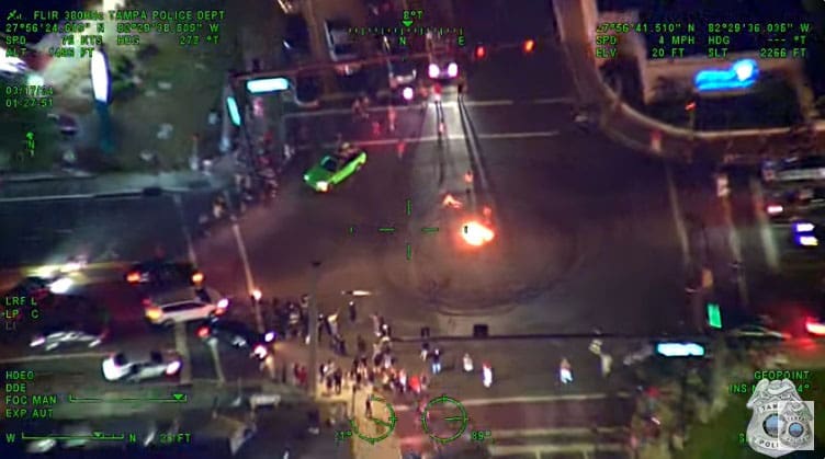Officers with the Tampa Police Aviation Unit observed a group of subjects lighting a fire in the intersection as a green Ford Mustang engaged in reckless driving, doing donuts, and impeding traffic in the blocked intersection.
