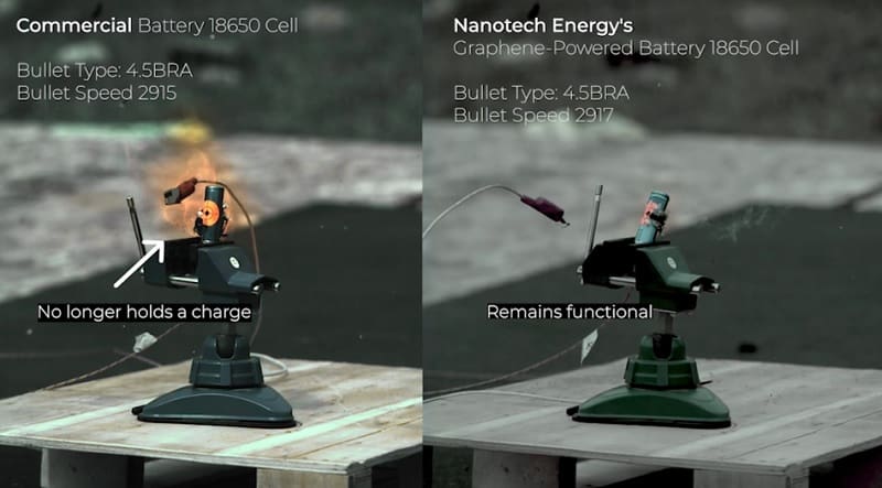 A Nanotech Graphene-Powered Lithium-Ion Battery 18650 cell was shot by a 4.5BRA bullet at a speed of 2,917 feet per second. Despite the ferocious force of impact, the battery did not catch fire and even still held a charge.