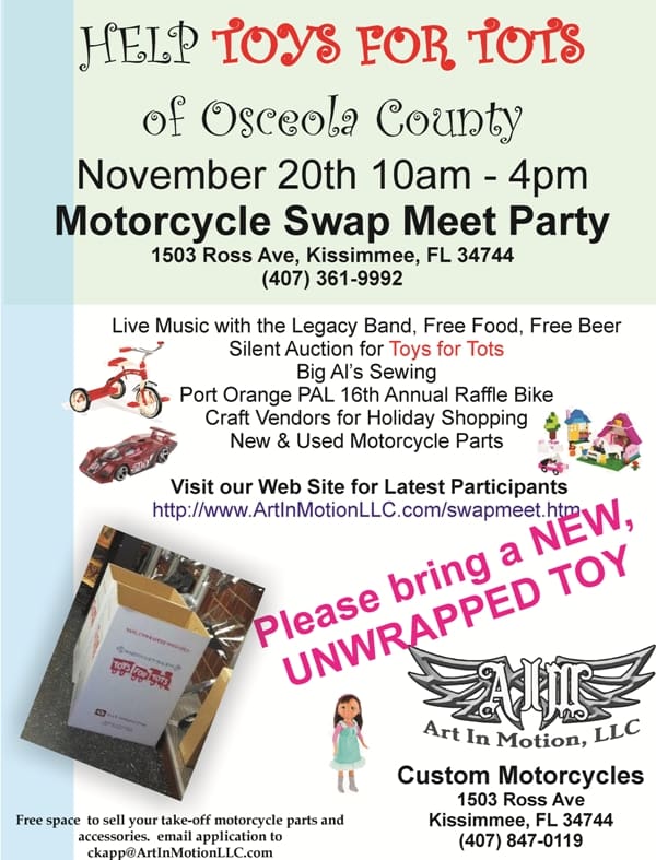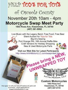 Free admission. Join us on November 20th from 10am – 4pm to collect toys for Toys for Tots of Osceola County. Please bring a new, unwrapped toy.