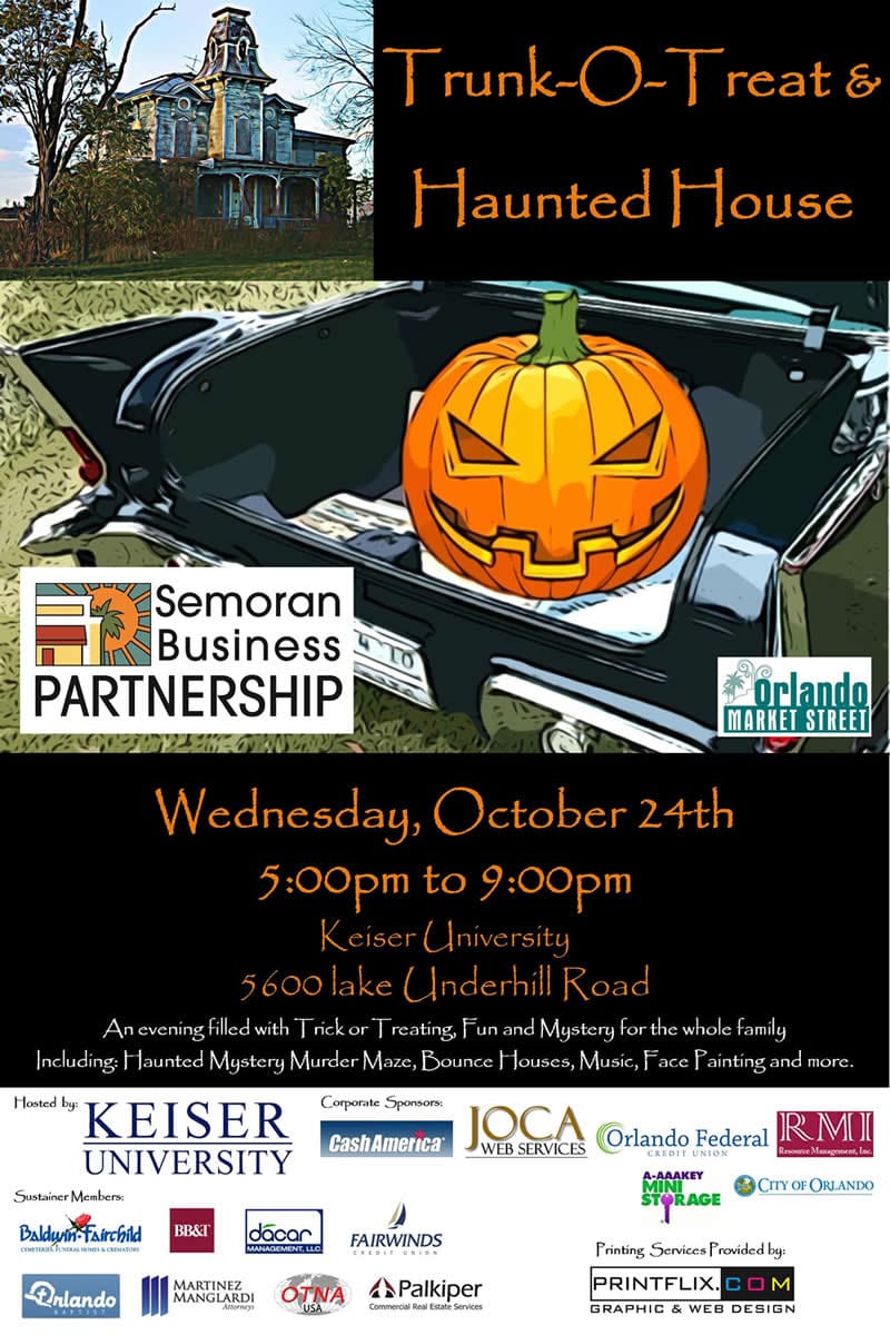 Semoran Business Partnership, a City of Orlando Market Street Program, has paired up with Keiser University for a fun filled Halloween themed Trunk-O-Treat and Haunted House event.