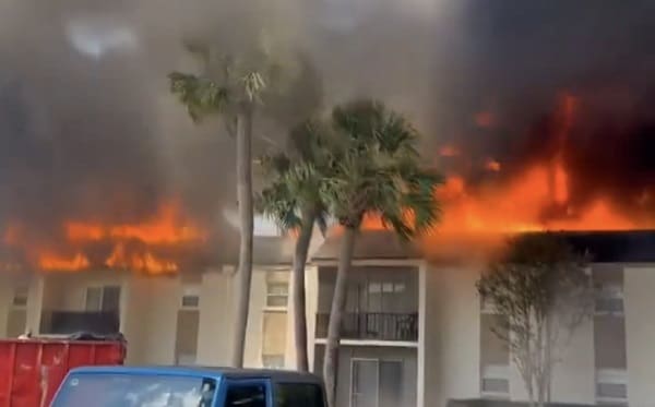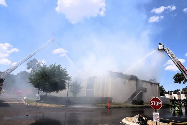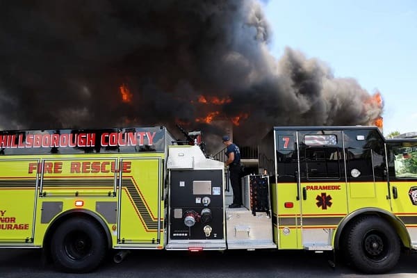 Hillsborough County Fire Rescue responded to a two-alarm fire on Clocktower Drive in Brandon, near Tampa. At 2:47pm, 911 calls flooded the local dispatch center from callers reporting fire through the roof of the two-story apartment.