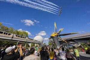 As part of Disney’s enduring respect for those who serve in the military and their families, Walt Disney World Resort in Orlando recently hosted the U.S. Air Force Thunderbirds flight demonstration team for a flyover of Magic Kingdom Park and EPCOT.