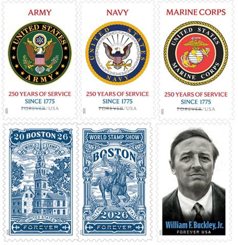 The U.S. Postal Service announced stamps celebrating the 250th anniversaries of the U.S. Army, U.S. Navy and U.S. Marine Corps, a stamp previewing the 2026 World Stamp Show in Boston and a stamp honoring writer William F. Buckley Jr.