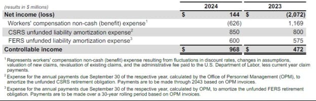 This includes controllable income which is not calculated and presented in accordance with GAAP. This non-GAAP measure is calculated as net income (loss) adjusted for costs outside of management’s control, including workers’ compensation expenses caused by actuarial revaluation and discount rate changes and the amortization of the CSRS and Federal Employee Retirement System (FERS) unfunded liabilities. These latter costs not only are largely outside of management’s control but also can fluctuate significantly based on actuarial assumptions and interest rates.