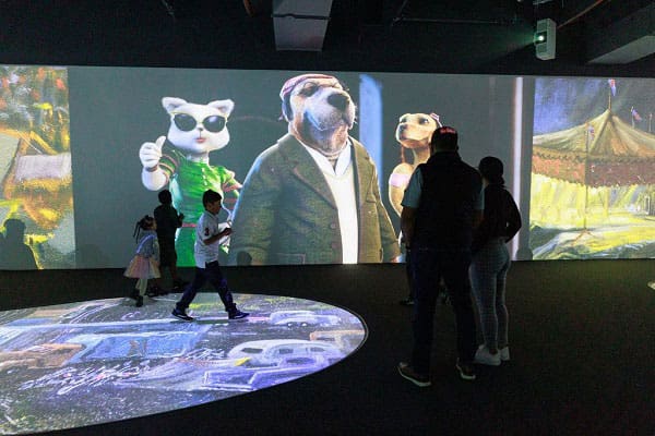 The Lonely Dog Immersive Experience, located at 4950 International Drive in Orlando, tells the story of a misunderstood orphan who overcomes bullies to become a legend whose music heals a divided society of posh cats and working-class dogs in the fictional world of Alveridgea, as animated paintings, 3D imagery, and original music are projected throughout the digital theater for an immersive, 30-minute cinematic show.