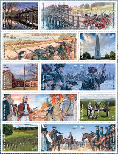 The pane of 15 stamps memorializes five turning points in the fight for American independence. Watercolor paintings depicting scenes of five battles appear alongside photographs of sites involved in each battle.