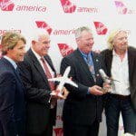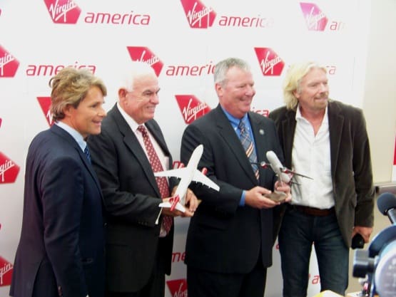 Virgin America President and CEO David Cush present Orange County Mayor Richard Crotty and Orlando Mayor, and Vice Chair of the Greater Orlando Aviation Authority, Buddy Dyer ceremonial aircraft models. Sir Richard Branson, Virgin Group Founder also joined the celebration of the new air service for MCO.