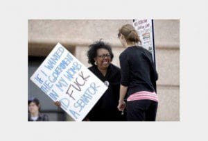 While McIntyre acknowledged that some in Oklahoma, may find her sign’s language offensive, she said that the “personhood” bill is “wrong, unbalanced and outrageous.”